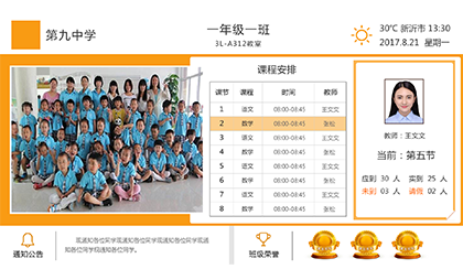 电子班牌可代替班级黑板报、墙体等传统展现宣传方式。每个班级安装一个班牌,它能够提供班级人数、班级考勤情况、班级课表、班级相册、班级通知等信息。