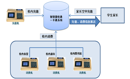 通过智慧微校通一卡通系统,学生完成的消费不但在系统内形成消费记录,家长手机微信将还收到实时消费信息、余额提醒等推送信息,同时家长可在微信上给学生进行空中充值。