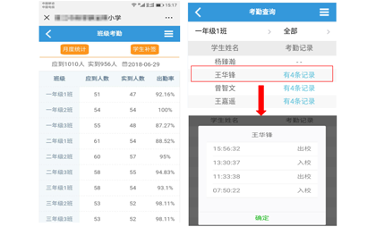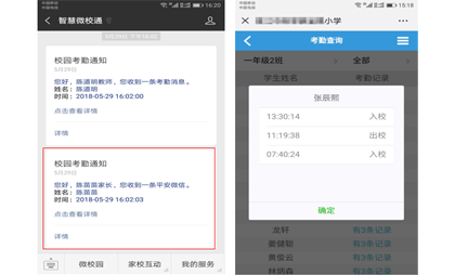 利用现代智能卡技术,在学生进入或走出校园时,智慧微校通平台自动发送学生出、入校时间到家长微信上,便于家长及时了解孩子到校离校情况,安心于自己的工作。
