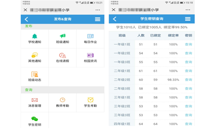 消息管理、教师考勤、学生考勤、学生密钥及绑定率移动端即时查询。